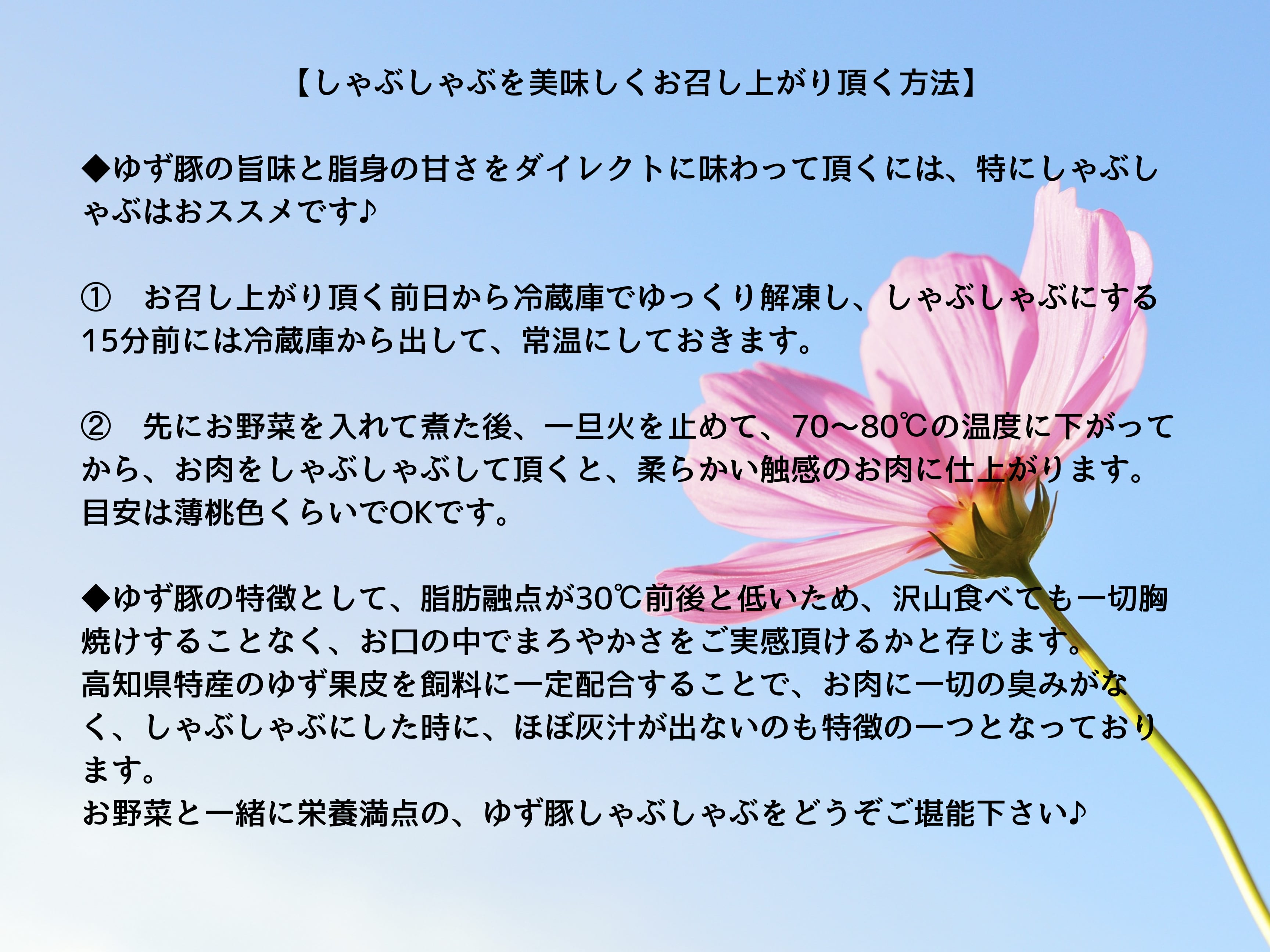ゆず豚は、国内産の米粉、おから等とゆず果皮を配合することによって、脂身が見た目にも美しく、食べると口の中でとろけます。ゆずを配合しているので、臭みがなく、脂身の多いバラ肉でも決して胸焼けすることがありません。ご年配の方からも大絶賛を頂いております♫